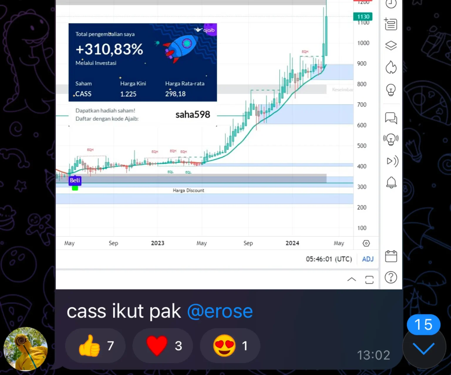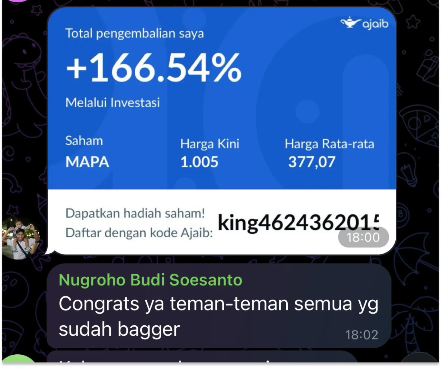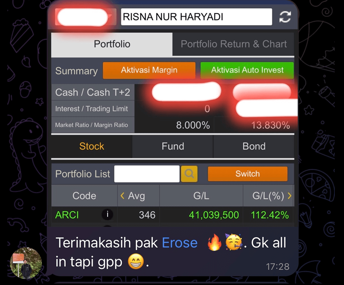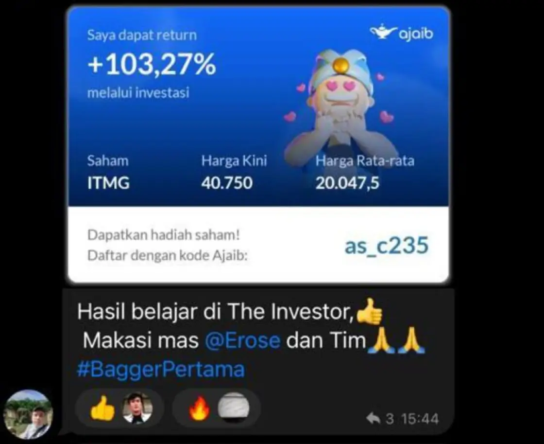 Pengalaman beliau menjadi investor dengan selalu ikut kelas. Salah satu member The Investor bisa bertumbuh dan bahkan mendapatkan bagger dengan tenang.